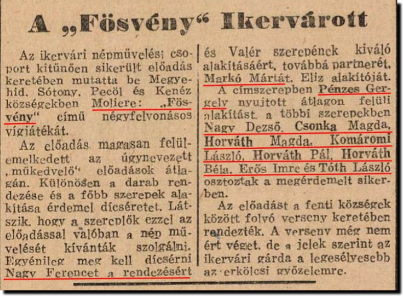Nagybátyám - Nagy Ferenc volt a rendező és szerepelt is a színműben. Az átlagon felüli alakítással megdícsért Pénzes Gergely a szakdolgozatot író Pénzes Juditnak az Édesapja. Az én Édesapám - Nagy Dezső is szerepelt a darabban, amit legalább öt faluban sikerrel adtak elő. Végül itt egy családi emlékem. A szakdolgozatban is látható Gyöngyvirágos huszárcsákó színműről, amiben szintén szerepelt Édesapám ( álló sorban balról a harmadikként).