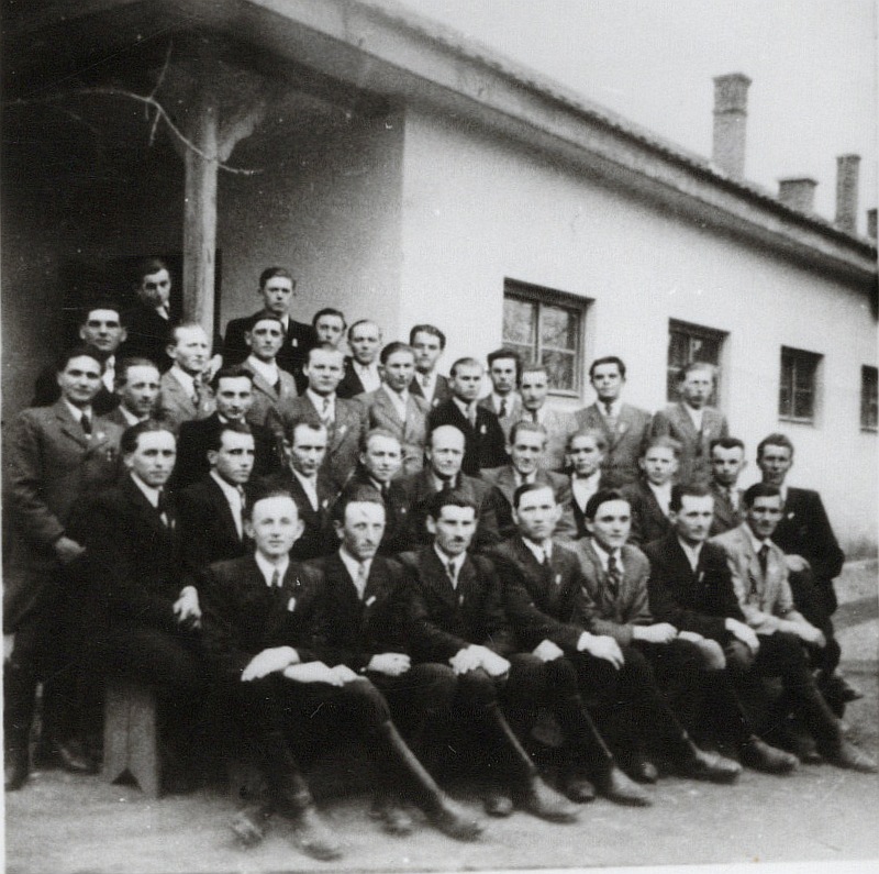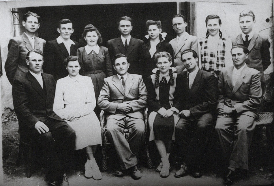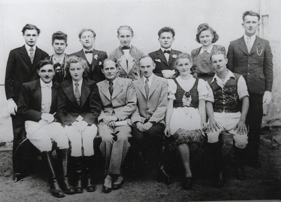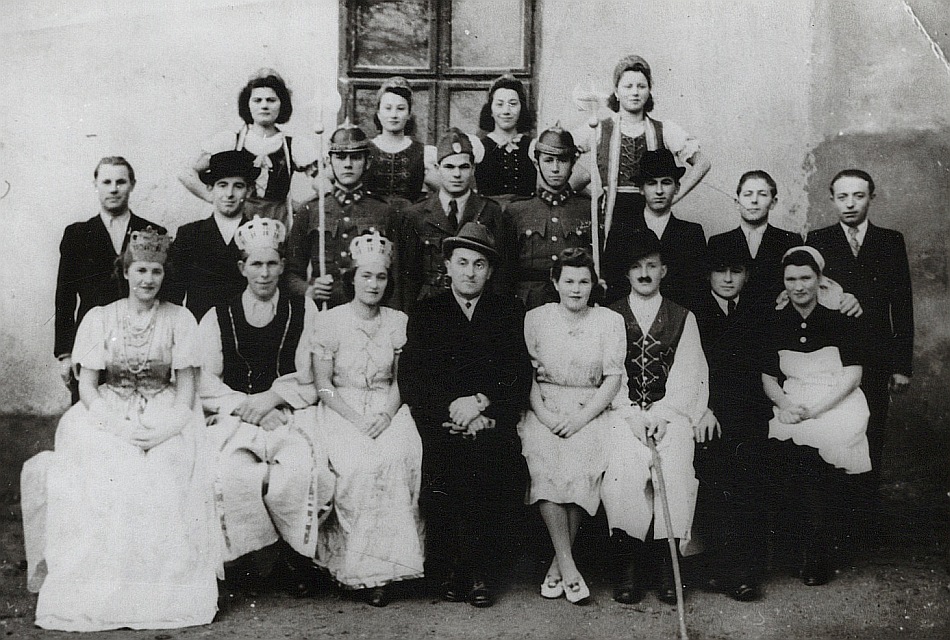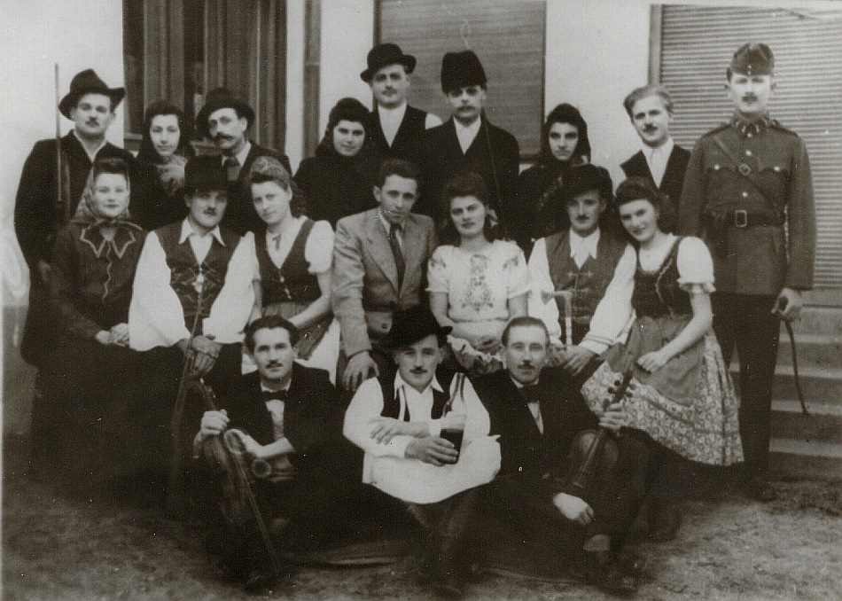 A Juhászlegény, szegény juhászlegény szereplői. Középen a darab betanítója, Lakner Lajos, aki a felszabadulás után is nagy szerepet játszott a falu kulturális életében.