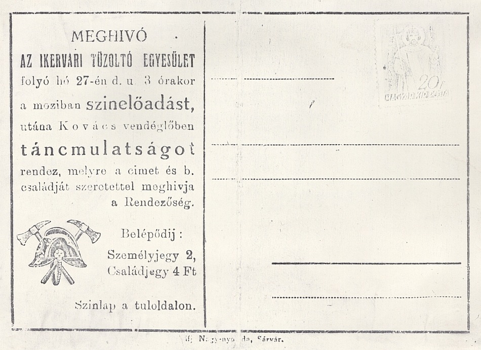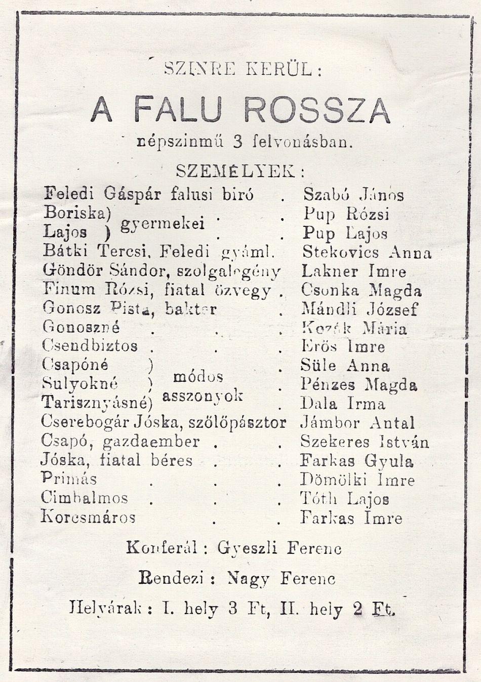A színlap Az előadást a Tűzoltó Egyesület rendezte. A darabot Nagy Ferenc tanította be. 1947-ben Pölöskey János A puszta tündére című népszínművére került sor. A községi szabadművelődési ügyvezető a Vármegyei Szabadművelődési Felügyelőségtől kért engedélyt, amelyből az előadásról minden lényegeset megtudhattunk. /47./ "Az ikervári Szabadművelődési Tanács nevében tisztelettel kérem a Vármegyei Szabadművelődési Felügyelőséget, hogy az alant feltüntetett népszínműre az előadási engedélyt megadni szíveskedjék. Az előadást rendezi az ikervári Szabadművelődési Tanács ifjúsági csoportja. 1. A népszínmű címe: Pölöskey János: A puszta tündére c. három felvonásos népszínmű. 2. Az előadás helye: Ikervár, 1947. évi június hó 5-én, úrnapján d.u. fél 4 órai kezdettel a templom melletti szabadtéren. 3. Helyárak: I. hely 1.-Ft, II. hely 5o fillér 4. A tiszta bevétel a szabadművelődési célokat szolgálja. A háború folyamán elpusztult színpad pótlása és a szabadművelődési könyvtár gyarapítása. 5. Az ügyvezető a könyvet átnézte, amely a demokratikus követelményeknek megfelel, kéri az engedélyezését. 6. A színelőadás előtt sorsjátékot - Tombolát - szándékozunk rendezni. A kisorsolásra kerülő tárgyakat közadakozásból szerezzük be. A jegyek ára 50 fillér. A tiszta bevétel szintén a fent említett szabadművelődési célokat szolgálja, továbbá sportfelszerelési hiányok pótlását. Tisztelettel kérem, a Vármegyei Szabadművelődési Felügyelőséget, amennyiben szükséges úgy az erre vonatkozó engedélyt, vagy jóindulatú véleményezést megküldeni, vagy az útbaigazítást megadni szíveskedjék. Ikervár, 1947. május 14-én Lakner Lajos Komáromi Mária kántor tanító ügyvezető A műsorengedélyezést Medgyes János felügyelő-helyettestől kapta a 419/25-Ev/1947. számú levélben. A fenti két dokumentumból is kitűnik, hogy a darabokat nem önállóan játszották, hanem mindig valamilyen alkalomhoz kötötték. A Falu rossza - bálhoz volt kapcsolva, ez utóbbi pedig egyházi ünnephez. Ez a megállapítás szinte valamennyi előadásra igaz. Általában télen játszották, akkor volt rá idejük, hiszen a mezőgazdaságban ekkor szünetelt a munka, /A puszta tündére azonban ez alól kivétel./ A Piros bugyellárist 1948-ban adták elő. A rendező a Tűzoltó Egyesület, a bevételt is ők kapták, amiből sapkákat vásároltak egyenruhájukhoz. A színművet egy évben Sárváron is előadták. A betanító és rendező Deli József volt. A színdarab engedélyezését a következő levél tartalmazza: /48./ Önkéntes Tűzoltó Egyesület Ikervár Tisztelettel közlöm, hogy Csepreghy : Piros bugyelláris c. színmű előadását véleményezem. Az előadáshoz engedélyt az illetékes rendőrkapitányságtól kell kérni. Szombathely, 1948. január 7. Medgyes János felügyelő h. Szintén 1948-ban adták elő a Mágnás Miskát. A színdarabot a tűzoltószerháznál tanulták be, a rendező szerv a Tűzoltó Egyesület volt. Az előadásra május 19-én került sor.