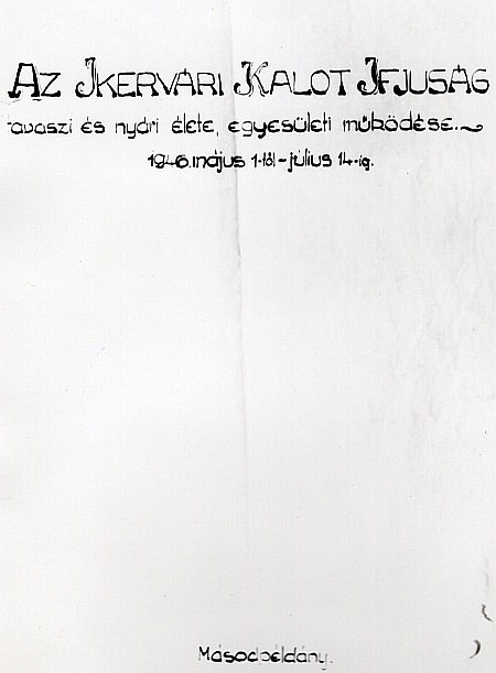 KALÁSZ Az 1939. február 12.-e után kiadott alapszabály így határozza meg a Katolikus Leánykörök Szövetségének célját: "Hitükben erős, erkölcsükben tiszta, nemzeti érzésükben öntudatos és gazdaságilag képzett családanyákat neveli a falu leányaiból. Eszközei: tanítónők, vagy más megfelelő képzettségű hölgyek vezetésével foglalkoztatni lányokat. 1. / Lelkileg: közös imádság szentségekhez való közös járulás közös szentségimádás és lelkigyakorlatok tartásával. 2. / Szellemileg: vallásos jellemképző kulturális, gyakorlati tárgyú előadásokkal. 3. / Gyakorlatilag: főző, háztartási, varró és háziipari tanfolyamokkal. 4. / Kedélyileg: dalok, játékok, táncok tanításával, kirándulások, versenyek, színielőadások rendezésével, tisztességes szórakoztatással. /101./ Az alapszabály szerint az egyesület igazgatója a helybeli plébános, vagy az általa megbízott lelkész. Vezetője: "A falu intelligenciájának katolikus hölgytagja, a- kit a plébános úr erre a szövetséggel egyetértve felkér." /102./ A dokumentum meghatározza azt is, hogy ki lehet az egyesület tagja: A lánykörnek az elemi iskola elvégzésétől vagy 12 éves kortól 14 éves korig jelöltje, azon túl felvett tagja lehet minden tisztességes, katolikus leány, aki az összejöveteleket pontosan látogatja, viselkedése ellen kifogás nincs, és felvételét a vezetőségtől kéri." /103./ Az ikervári leánykör először 1941. november 9-én alakult meg, Kovács Margit tanítónő vezetésével. Ekkor 20 fiatal lány lépett a tagok sorába. Alapító tagok voltak: Jóna Mária, Juhász Magdolna, Lakner Terézia, Majsa Terézia és Nagy Ilona. Az egyesület hivatalos nyilatkozatban csatlakozott a szövetséghez. /104./ A KALÁSZ a háborúig működött, utána szüneteltette tevékenységét, q felszabadulás után, még 1945 telén megkezdték újjászervezését, engedélyt kértek működésére. A járási aljegyző felhívta az egyesület figyelmét: "hogy az elveszett alapszabályok sürgős pótlásáról gondoskodjék. Alapszabály hiányában a további működése nem engedélyezhető." /105./ 1946-ban ismét megalakult, vezetője Komáromi Mária tanítónő, szabadművelődési ügyvezető lett. Ő számolt be tevékenységükről.Sok lány jelentkezett, többségükben paraszti családok tagjai. A foglalkozások télen is és nyáron is a római katolikus népiskolában voltak, a mai óvoda helyén. Minden szerdán este összejöttek, időnként még 70-en is. Problémáikkal minden esetben a községi bíró Márczi Józsefhez fordultak, aki készségesen segített. Minden alkalommal hallgattak valamilyen előadást, énekeltek, játszottak. Az előadások történelmi, földrajzi, hazafias és illemtan témájúak voltak, de sokszor minden nap hasznosítható gyakorlati tanácsokat, útmutatásokat is kaptak. Az előadó az egyesület vezetője, időnként pedig a plébános volt. Néhány cím az előadások közül: Hun-magyar mondakör, Változatos főzés, Fűtés-szellőztetés, Hőmérő-lázmérő, Kertészet, Illik - nem illik. Az előadásokhoz segédanyagot nem kaptak, önállóan állították össze. Játék nélkül nem múlhatott el egyetlen foglalkozás sem. Leginkább népi játékokat tanultak: Elvesztettem páromat, Egyszer egy királyfi, stb. Játéktanuláshoz ezt a kis könyvecskét használták leginkább, mivel nem csak a dalok szövegét és dallamát tartalmazta, hanem az eljátszás módját is.